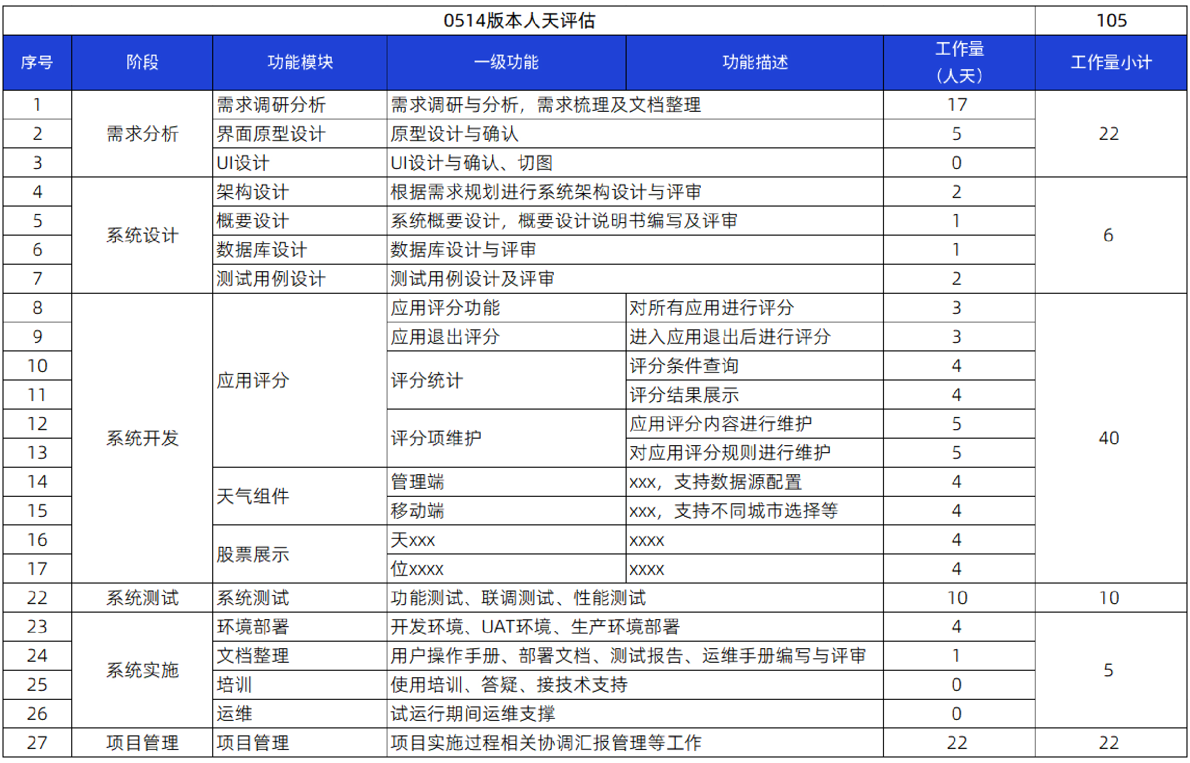根据需求评估结果和迭代周期的安排,对每次版本更新涉及到的工时进行评估。在工时评估初期,由于开发人员技术能力存在差异、对需求复杂度的认同程度不同,导致工时评估工作一直拉扯。经过一段时间的磨合,甲乙双方对工时评估已经达成了一定的共识,例如H5应用开发,先对开发难度进行评估,再根据难度等级对开发人天进行评估,对于项目经理和产品经理这种持续投入的人员,按人月这种形式进行评估。