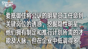 为团队配备“隐性明星”。要抵御住将公认的明星员工任命到关键岗位的诱惑。相反,要挖掘隐性明星,他们拥有制定和推行计划所需的才能及人脉,但在企业中低调得多,因此超负荷工作的可能性远没有那么大。另一个好处是,这些人通常受公司“这就是我们这里做事的方式”心态的影响较少,因此可以给一个正寻求重新定义流程及重点的项目带来新鲜的视角。为关注度高的敏捷团队选择这些不太惹眼的人,还可以让企业建立更深层的后备人才库。