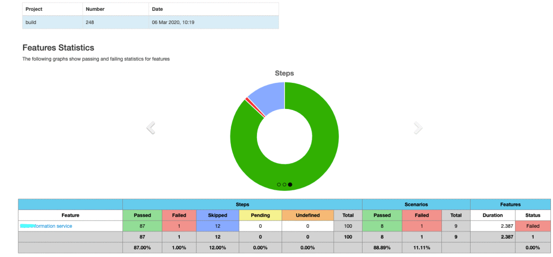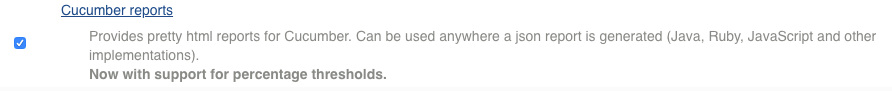 另外Jenkins有非常丰富的插件库,在选择测试工具的时候可以把是否有Jenkins报告可视化支持考虑进去。QA需要对Jenkins和测试工具都相当熟悉,还需要知道如何通过将某一测试工具生成的某种格式的测试报告集成在Jenkins上以方便一键获取测试报告。像cucumber的测试报告插件: