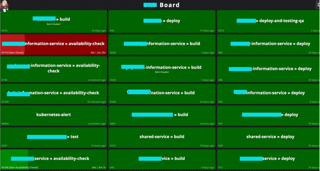 项目上用的是Jenkins自带的 Build Monitor View。将对项目pipeline的监控投影到电视上,并配置相应的提示音,能非常及时地让团队知道最新的构建、部署、测试状态。