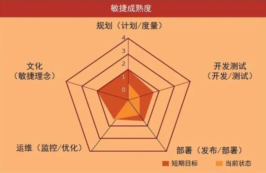 敏捷化开发要求敏捷开发团队的全体成员都要深入理解并认同敏捷的相关理念,掌握敏捷相关的方法和技术,并熟练使用相关的支持性工具。下图是根据通用的敏捷能力模型对某敏捷项目团队的敏捷能力水平进行的现状分析和短期提升目标设定: