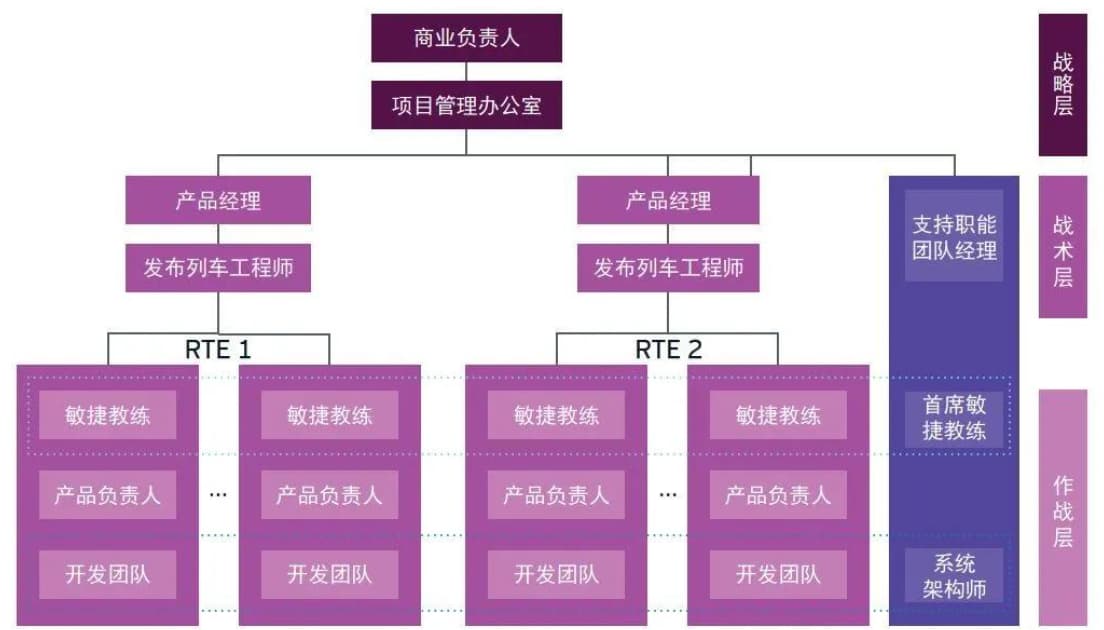 - 发布列车工程师:这个角色为整个项目集提供共同的架构指引和技术框架,从技术角度协调各个敏捷团队的开发进度,确保各个团队所开发的特性之间的相互依赖关系被识别并关注,通过安排集成测试等手段确保跨团队的集成顺利进行。