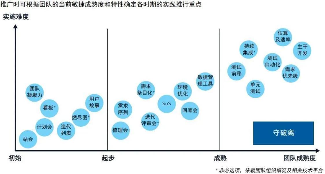 下图大致罗列了敏捷开发团队应当掌握的各种敏捷开发相关技能。其中,实施难度越高的技能,对团队的敏捷成熟度要求越高。