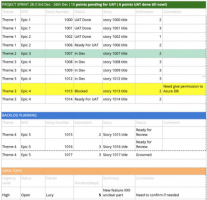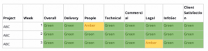 RAG是Red,Amber,Green的缩写,该报告采用了和交通灯一样的呈现方式,简单易懂,可以用来做项目、人员等的健康度报表,拿项目健康度报表举例,项目经理可以按照自己项目需要关注的维度制定该表,然后定期监控每一项是否健康,对于敏捷团队来说,一周一般就可以了。如下图: