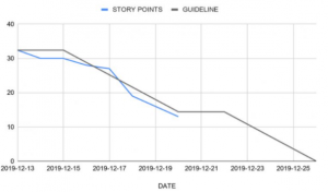 燃尽图是敏捷项目中最频繁使用的一类图表,它是在工作完成前对于进度的一种可视化表示。我们经常会利用迭代燃尽图来监控用户故事是否如期进行,当然也可以利用Feature燃尽图来监控MVP的完成情况。如下图: