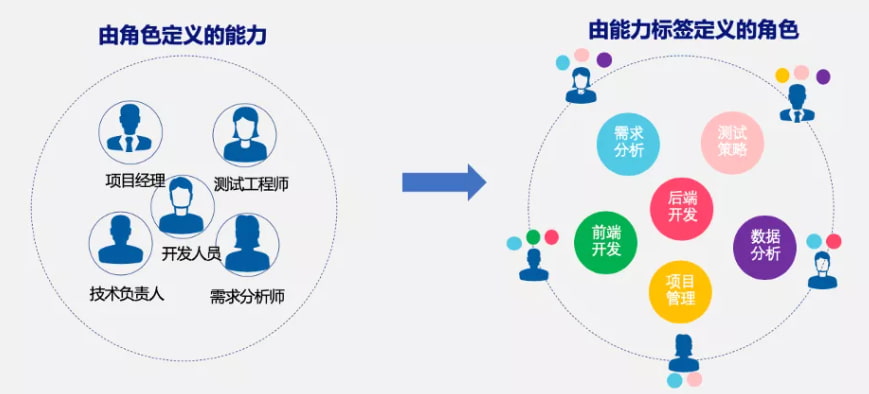 传统的软件 项目管理中,团队成员的能力和角色绑定,角色和特定的技能绑定,当项目中有新任务产生或者成员离职,团队依赖外部提供资源供给,等待的成本高,当项目管理过程中出现瓶颈,则又会出现资源等待任务,出现浪费,由角色定义的能力大大降低了团队合作的效率。