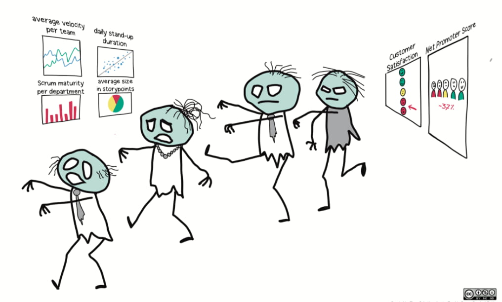 (看错了什么?僵尸化Scrum齐头并进,着重关注性能以及完成了多少工作。但是客户满意吗?重要功能交付了吗?)