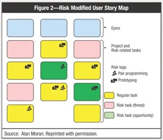 风险评估提供确定风险响应(例如,避免、接受、利用)所需的输入。有些风险可以通过开展具体活动(称为敏捷风险管理中的“风险任务分配”)来解决,有些则需要关注活动所采取的方式(称为敏捷风险管理中的“风险标记”)。例如,开发产品用户界面时出现的需求风险可能会鼓励团队使用结对编程——一种两个个体协同工作的敏捷技术—— 来执行所有这类用户故事。因此,在稍后的迭代过程中,团队会识别所有受影响的活动,并将其标记以关联与该风险处理决策(例如,可能使用一个双头的图标作为视觉提示,以使用如 图 2 所示的结对编程)。风险缓解看板会让人想到对风险相关任务进行颜色编码(例如,绿色为契机,红色为威胁),以支持风险的可视化。顺带地,这些做法也可以延伸到其他的敏捷工件,包括描述Epic和构成它们的用户故事之间关系的敏捷故事地图,如 图 2 所示。这使得风险分布展示出优质的可视化效果,甚至能检测出风险分析可能不足的地方(例如,没有明显的上行或下行风险的用户故事集)。
