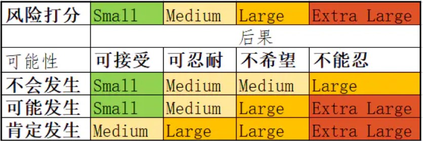 风险评估涉及对风险暴露的测定(其中 T 恤型号即可满足要求,例如,使用Small,Medium、Large和Extra Large表示量级)和基于风险所在的暴露带对风险打分(用于之后的风险监测)。这个分数需要考虑固有风险,并应包括需求或任务中涉及的内容,以及如何完成这种需求或任务(例如,使用减少风险的敏捷技术)。风险暴露也是风险优先定级的核心内容;反过来,风险优先定级也表明了为了应对项目风险而开展学习的紧迫性。如下图,风险暴露带评估和风险打分: