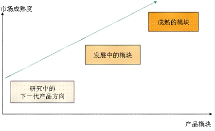 - 发展中的模块:指的是刚推出市场并且具有强劲的市场生命力、符合客户当前几年的业务发展需求,正在被大客户所接受的功能模块。这些功能模块是产品占领市场的动力,是继成熟的功能模块后,产品的新的增长动力。