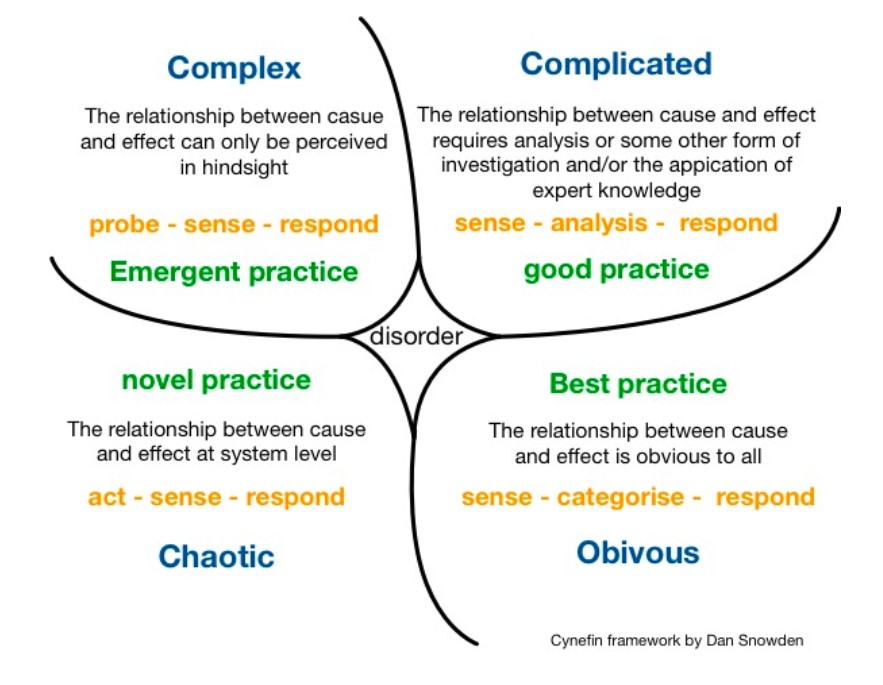 敏捷的规模化落地,本质是个Complex问题(Cynefin模型)。规模化敏捷框架的最大问题是将一个Complex领域的问题当成Complicated或者Simple领域问题来处理。一个多目标问题,其实是没有Good或Best practices的,唯一有指导意义的是一些价值观和基本原则。对待Complex领域问题,要采取探索-感知-响应模式,快速探索,感知问题的存在,采取行动响应,然后及时调整,对应问题的实践在这个过程中则会涌现出来,而不应该按照一个框架蓝图就开始配置实施。