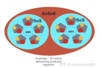 Scrum@Scale的团队容器设计十分特别,也是它的核心,所以这节会以较大篇幅去分析。从下图可以看到,Scrum@Scale组织结构里Team的最小单元是一个Scrum团队,一个Scrum of Scrum(下称SoS)的最结构是小于等于5个Scrum团队,再上一层的SoSoS也是同样的规则,可以有多层的SoSoSoS…..,所以Scrum@Scale的这种网状组织结构是可以支持无限大团队。至于为什么它设计的单元是5呢?背后的设计逻辑稍后会再作分析。