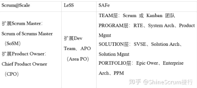 通过对比我们可以看到三个框架的组织结构设计都有它的思路,Scrum@Scale以仿生Scale-Free架构设计理论依据,支持可无限扩展的组织。LeSS在小范围内达到极致,到达一定极限后扩展成Huge。SAFe在到达一定上限时扩展多个ART和RTE。三者都以Scrum作为团队基础单元,LeSS的结构更像是Scrum@Scale的其中一种实现。