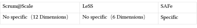 角色这个话题会有一个很大的反差,Scrum@Scale和LeSS与SAFe的理念完全的相反,SAFe中把有的都列出来了,基本上企业是能够对上号的,如架构师,发布经理等等,很容易让人联想到为什么SAFe是这么受市场欢迎。框架的设计也是考虑了市场化的因素在内,要知道导入SAFe的决策者也是利益分配者,失败对于导入者是不能接受的风险。角色引入容易,但要撤销就十分的困难,LeSS设计得这么轻和尽可能少的角色,目的就是让用户能快速导入,对于一些从Scrum团队发展起来的企业会比较适合进行扩展。那么是否意味着将要转型的企业选择LeSS和Scrum@Scale不适合呢?上述的上下文是企业收支平衡的状况下,倘若企业都要快倒闭了,那么决策的重点就不是在这里了,决策者更关注的还是在是否对现有的团队有重大的改变或者未知的风险。那么LeSS和Scrum@Scale的确相对于SAFe会有更大范围组织变革,它们更倡导的是用最短的时间过把组织结构调整过来,而不是一个渐变的过程,因为在渐变的过程中也要不断思考和调整,这样的过程也是一种浪费。以上两个问题都与精益思想吻合,延迟决策和消除浪费。