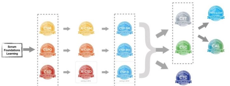 学员完成入门级CSM并通过认证考试后,可以根据自身需要提升CSM等级,升级时需要参加相关培训,不需要参加考试。CSM包含如下几个等级: