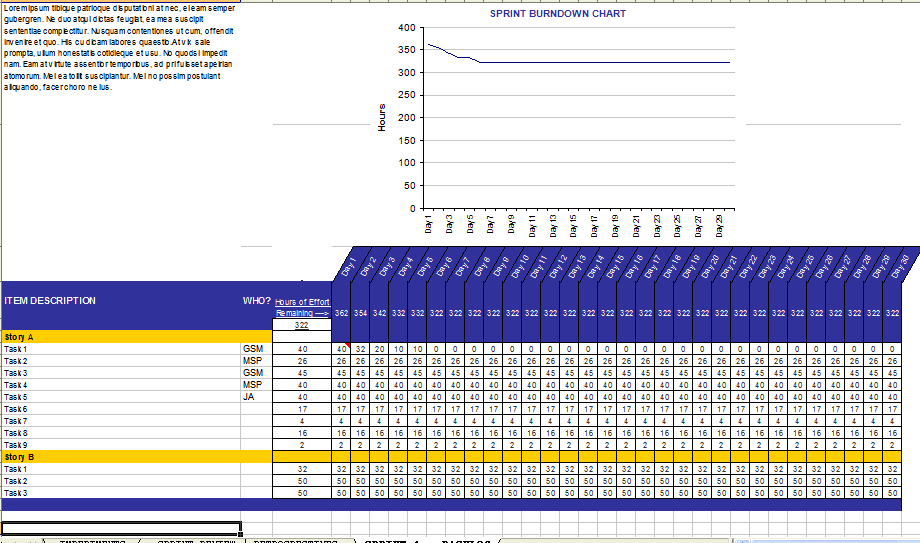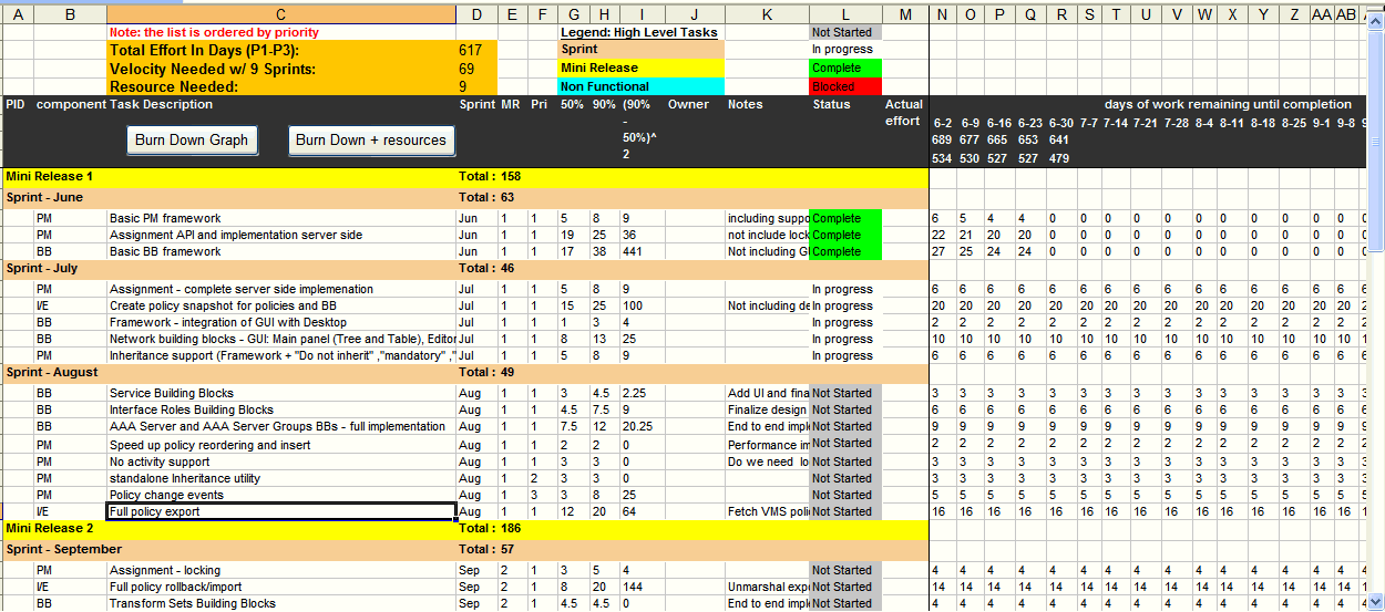 除了白板和即时贴之外,还有很多公司使用excel来进行scrum管理。其方式就是使用excel的工作簿来建立表格,跟踪story list和task list,同时通过excel的统计功能,来绘制相应的燃尽图等图表。来看图: