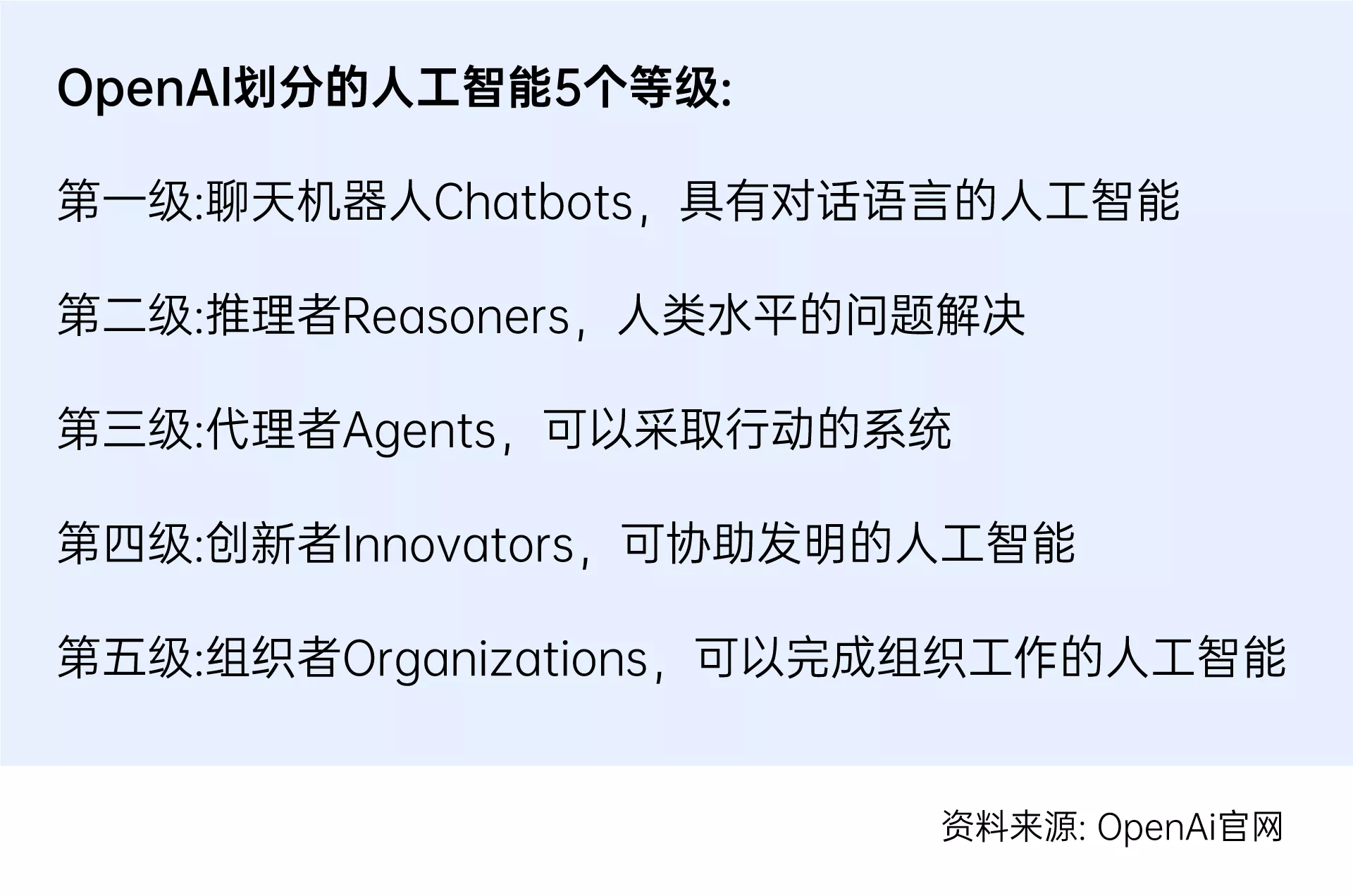 ChatGPT和AIGC在2023年引爆AI圈,从最初的被娱乐化,到后来随着大模型的迭代成熟,越来越多的企业开始尝试将AI应用在生产中,期望AI能帮助企业解决现实的业务问题。根据OpenAI的官方资料显示,目前人工智能根据发展特性大致分为了5个等级: