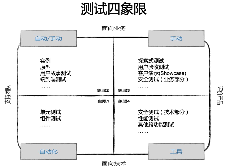 程序员编写的代码可以使得左侧面向业务的测试通过,但也可能没有产生客户真正想要的东西,因此还需要第三、第四象限的评价产品的测试。第三象限是面向业务的评价产品的测试,通过模仿真实用户使用应用的方式,帮助确认是否构建了真正需要的产品;第四象限是面向技术评价产品的测试,主要采用工具和相应的技术来评价产品的性能、健壮性和安全性等非功能特性,并且在开发周期的每一步都要考虑这些测试的开展。