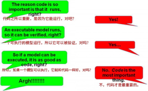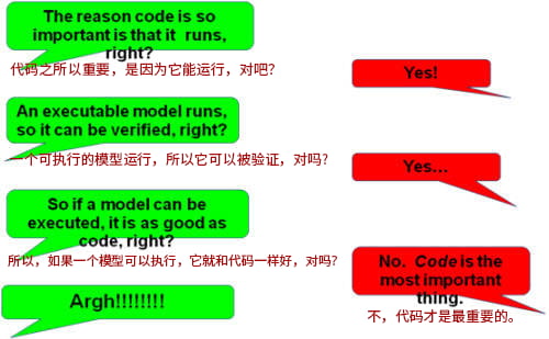 Steve 与其他人意见相左,是因为他们在“模型”这个词的含义上各持己见。一些签署人把模型视为草图,用完即扔;更让人愤怒的是把模型视作蓝图,画完后直接扔给隔壁言听计从的开发人员。这些做法 Steve 都不认可,他认为模型是可以运行的。