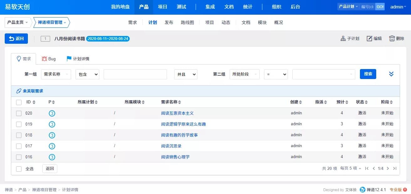 大家好,禅道项目管理软件开源版 12.4.1 发布,本版本集中优化了部分性能,当数据量比较大时,性能得到明显提升;在计划、发布、版本等关联需求页面实现分页操作,避免了因数据量太大导致加载时间过长问题;另外,修复了若干Bug。